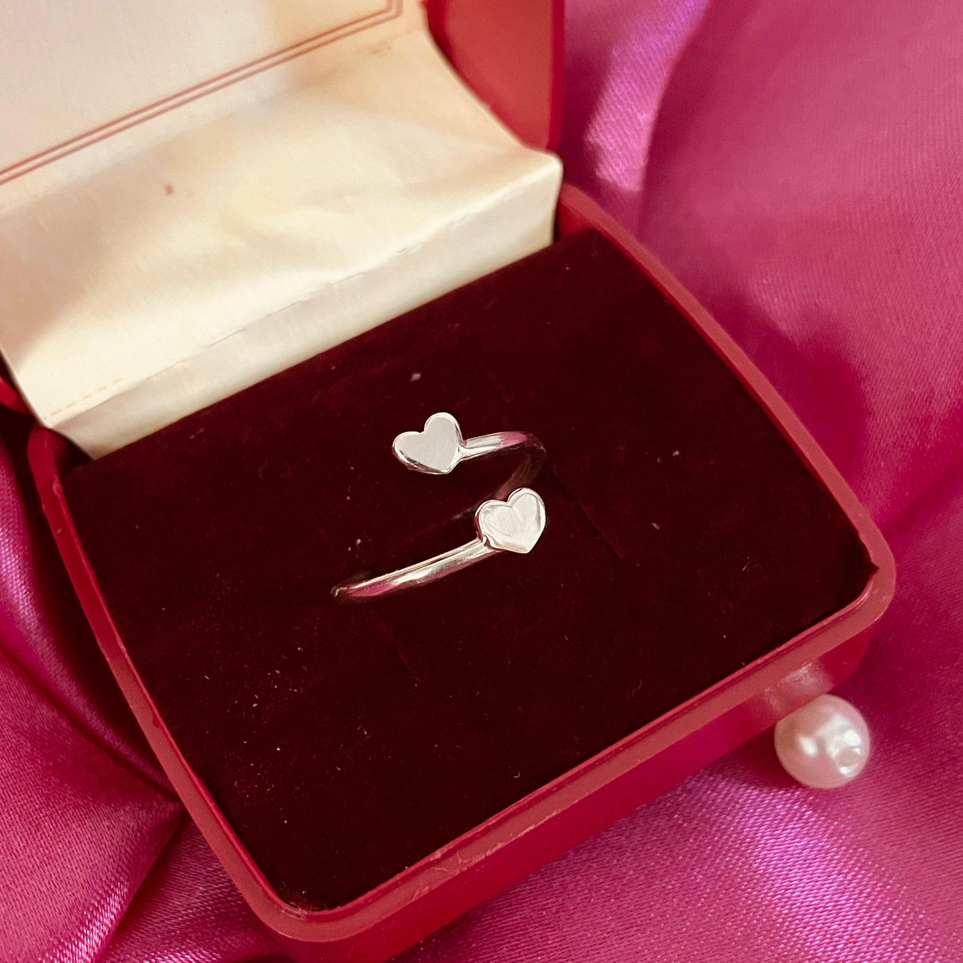 Twice the heart, twice the love. Our Double Heart Silver Ring is a sweet and symbolic piece crafted in fine 925 sterling silver. Featuring two petite hearts facing each other on an open band, this ring is a celebration of connection—between friends, lovers, or even self and soul.