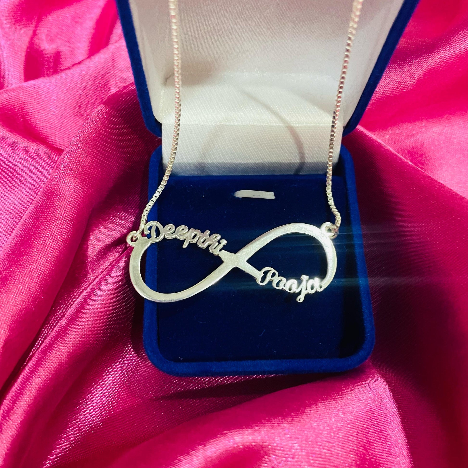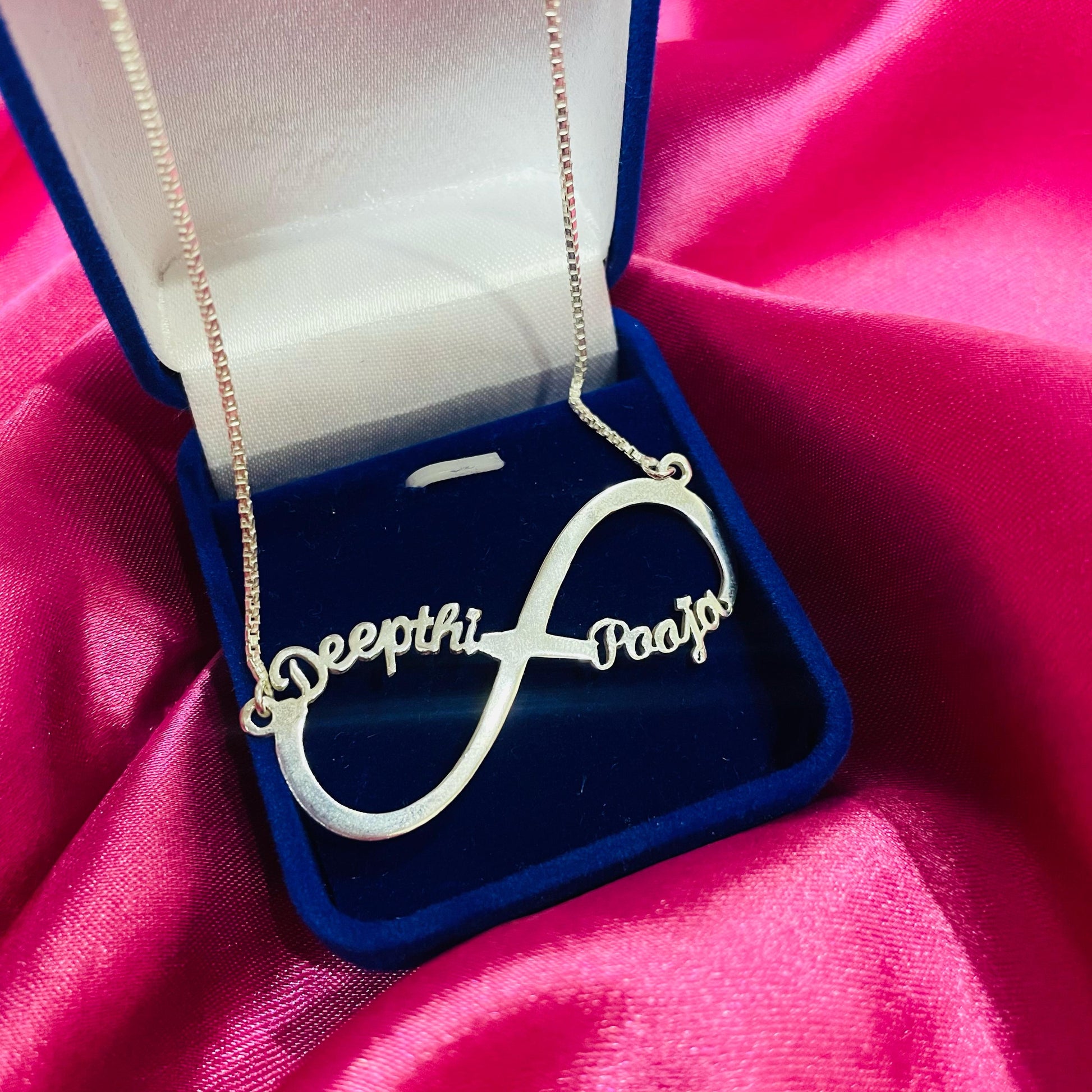 It features a gracefully designed infinity symbol, meticulously customized with two names of your choice.