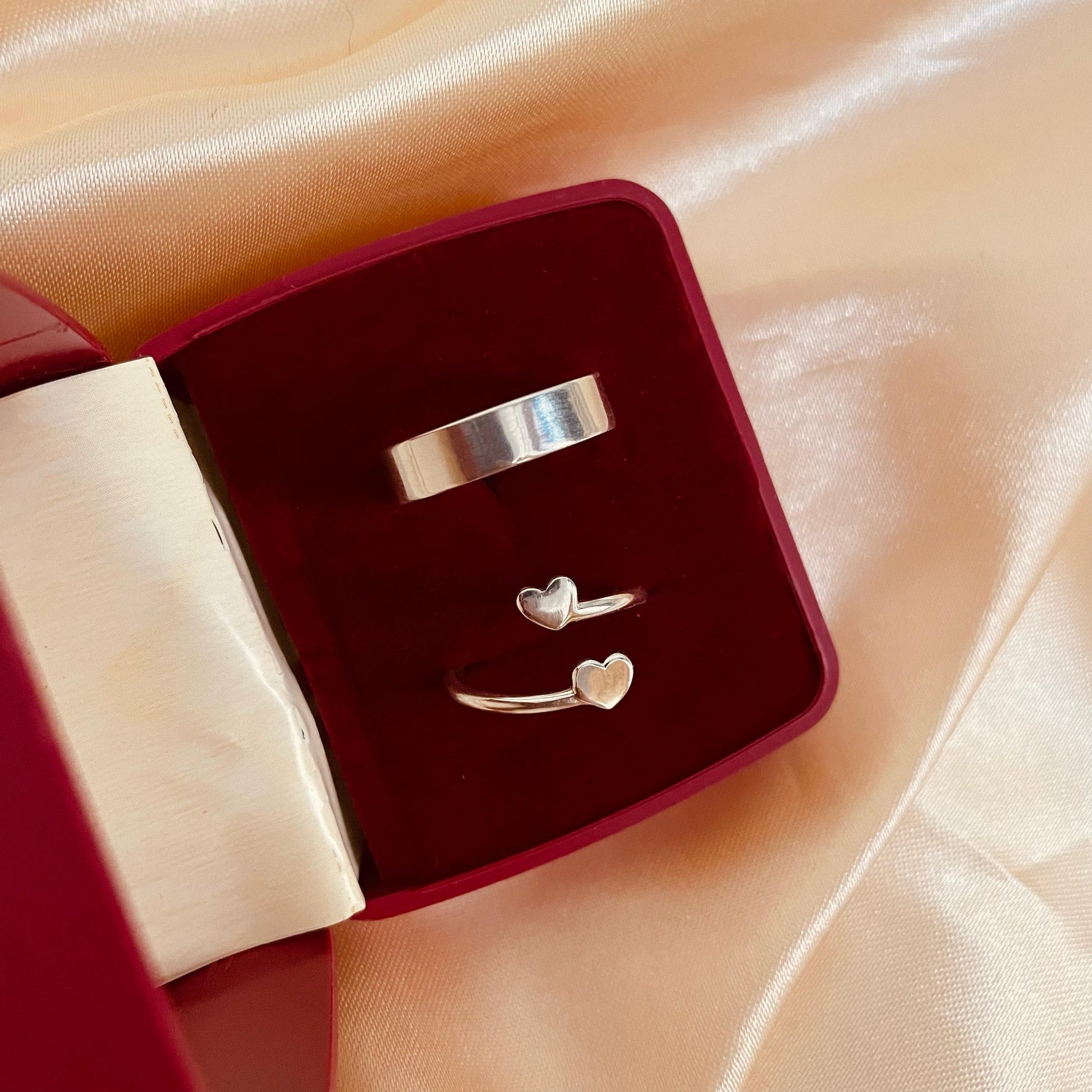 Let love speak through simplicity and charm with the Hearts in Harmony couple ring set. Designed for modern romantics, this set features a minimal solid silver band for him and a delicate open ring for her with twin heart motifs — symbolizing two souls, perfectly in sync.